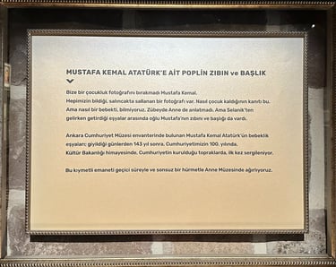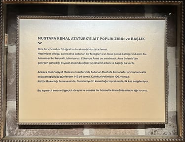 ^Müzenin romantik ve nostaljik atmosferine kendiniz kaptırırken sanatsal müzecilik anlayışıyla da estetik açıdan hem kalbinizi hem de gözünüzü ziyafete davet ediyor adeta. Müzede sergilenen birçok nadide eser var ancak benim en çok dikkatimi çeken Atatürk'ün çocukluğunda giydiği poplin zıbın ve başlık oldu. Bugüne kadar Atatürk'ün bebekliğine dair hiçbir objeyi görmemişken burada ilk kez sonsuz minnet borcumuzun olduğu Ata'mızın hayata geldiği ilk dönemlerden beri kullandığı eşyaları orijinal halleriyle görmek oldukça değerliydi benim için.