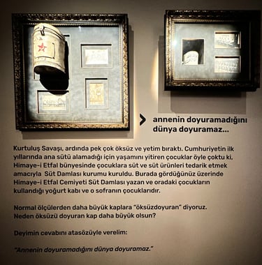 Cumhuriyetin ilk yıllarında anne sütü alamadığı için hayatını kaybeden çocuklar öyle çokmuş ki, dönemin Himaye-i Etfal (Sosyal Hizmetler ve Çocuk Esirgeme Kurumu) bünyesinde çocuklara süt ve süt ürünleri tedarik etmek amacıyla Süt Damlası kurumu kurulmuş. Buradaki eser de üzerinde Himaye-i Etfal Cemiyeti Süt Damlası yazan ve oradaki çocukların kullandığı yoğurt kabı ve o sofranın çocukları.