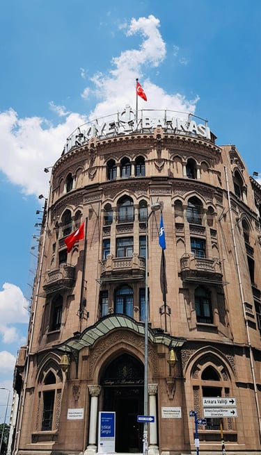 ^Mimari estetik açısından da kayda değer birçok detaydan bahsetmek lazım. 1929 yılında İtalyan mimar Giulio Mongeri tarafından inşa edilen dış cephesinde ağırlıklı olarak Osmanlı ve Selçuklu mimarilerinden figürler barındırıyor. İç dekorasyondaki vitray çalışmasında elinde gücün sembolü olan yılanlı asası ile Hermes tasvir edilmiş.