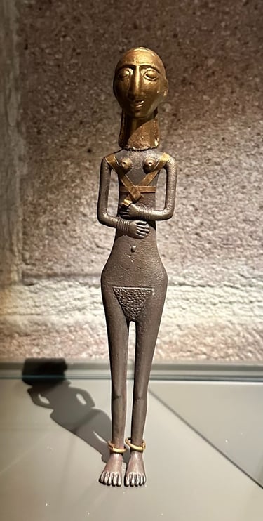 Kadın Heykelciği - M.Ö. 3000 Sonu: Her iki eli karnının üzerinde olan bu kadın figüründe, vücut çıplak olarak tasvir edilmiş ve göğsünde muhtemelen bir giysiyi simgeleyen çapraz bir bant vardır.